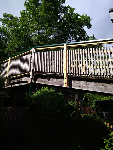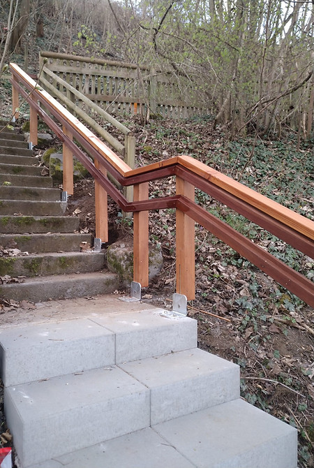 Ein Treppengeländer für kleine und große Leute (70 und 90 Zentimeter hoch) auf dem Spielplatz.